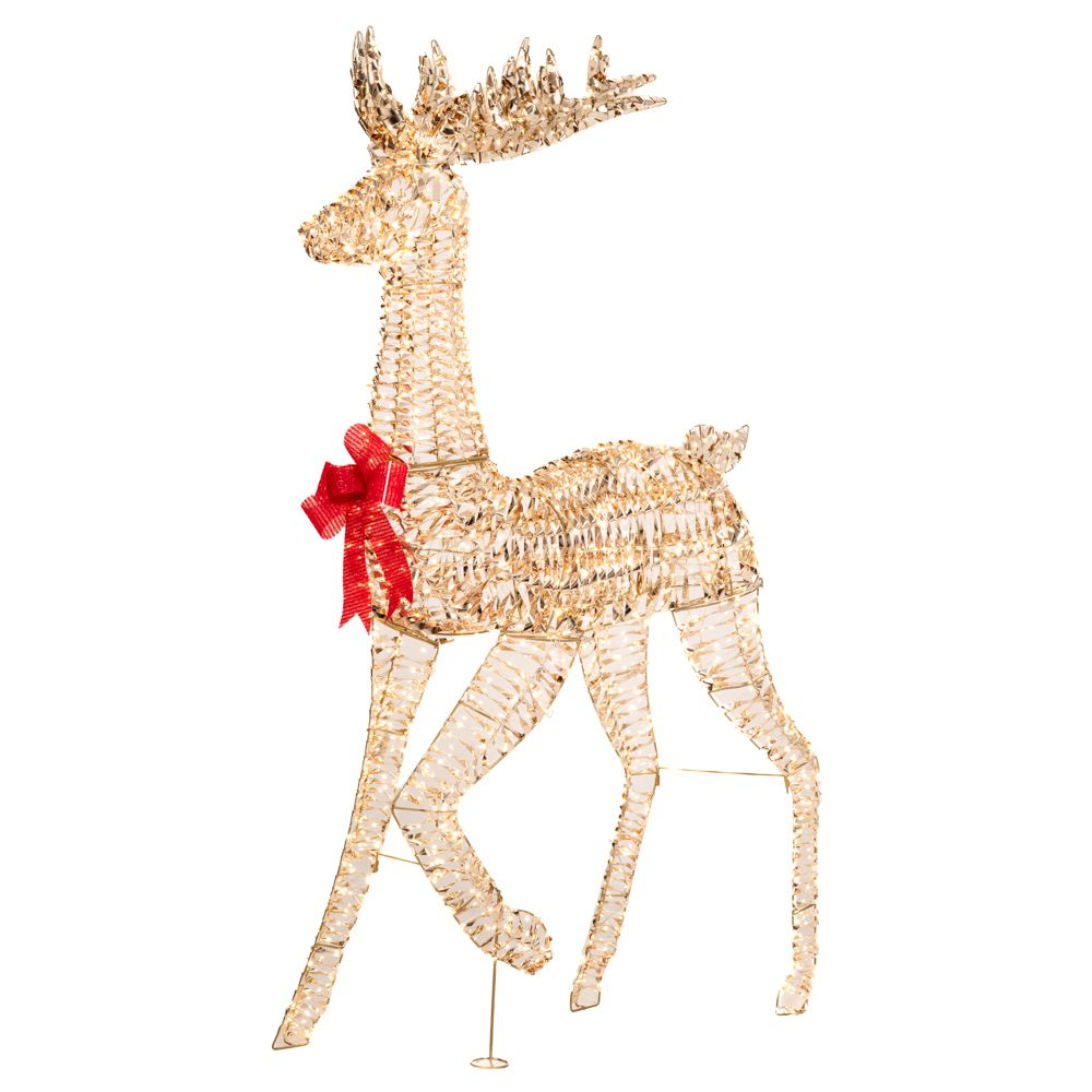Adaugă o notă magică decorului tău de sărbători cu acest ren auriu iluminat, o piesă impunătoare și elegantă, perfectă pentru exterior sau interior! Cu o înălțime de 180 cm și 1440 de LED-uri alb cald, acest decor transformă orice spațiu într-un colț de poveste.