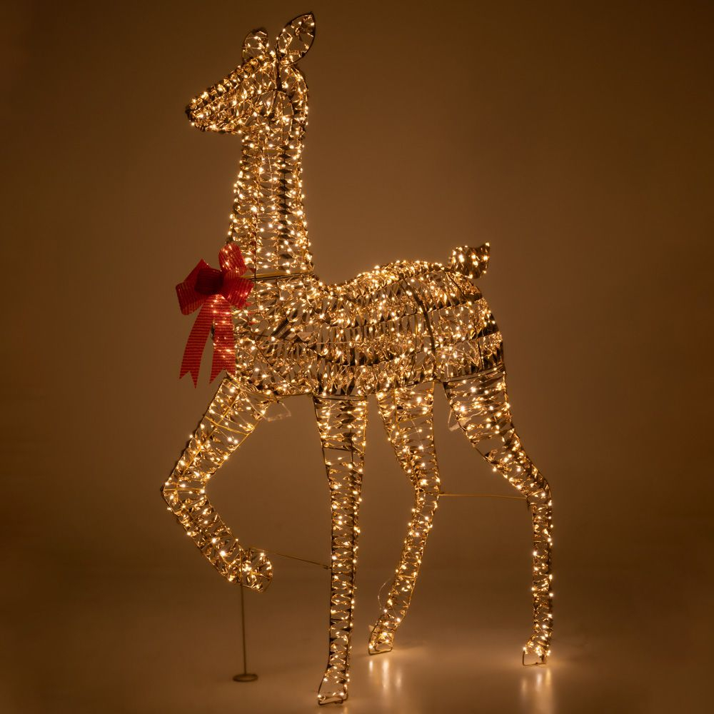 Adaugă o notă magică decorului tău de sărbători cu acest ren auriu iluminat, o piesă impunătoare și elegantă, perfectă pentru exterior sau interior! Cu o înălțime de 155 cm și 960 de LED-uri alb cald, acest decor transformă orice spațiu într-un colț de poveste.