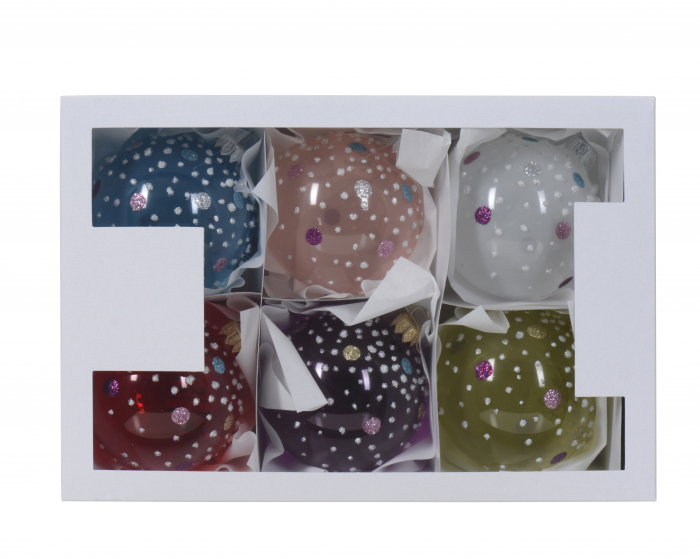 Set 6 globuri brad Craciun cu buline, 8 cm, sticla, multicolor
