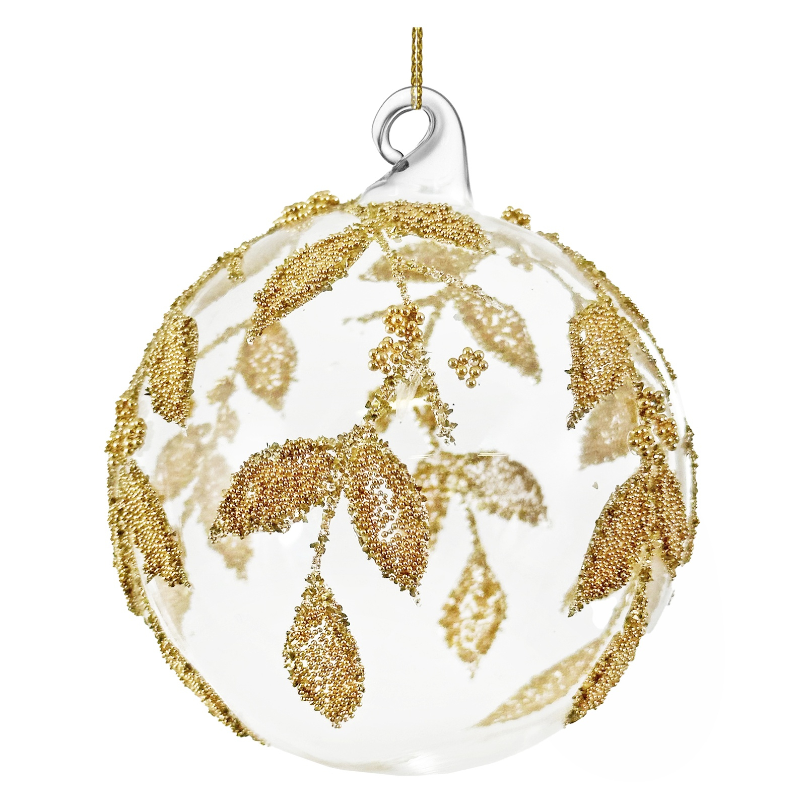 Glob brad Craciun cu frunze si margele aurii, 8 cm, transparent